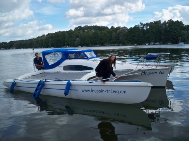 Für den Samstagvormittag stand ein Treffen mit Herrn Berndt Brussig an, der viele Jahre als Projektleiter eines Solarschiff-Projektes an der Humboldt-Universität gearbeitet hatte und voriges Jahr sein eigenes Unternehmen BSC BerlinSolarCulture gegründet hat: An Bord unseres Trimarans „l’espoir tri“ begeisterte sich Herr Brussig für meine technischen Neuerungen, z.B.: