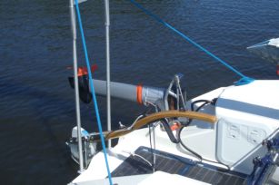 Ich konnte es mal wieder nicht lassen, ich habe an dem neuen Motor etwas verändert. Der Motor ging nicht hoch genug zu kippen. Das hatte den Nachteil, dass der Pylon beim Segeln immer im Wasser hing. Das machte krach und spritzte gerade wenn man schnell segelt. So hoch geht er jetzt zu klappen: