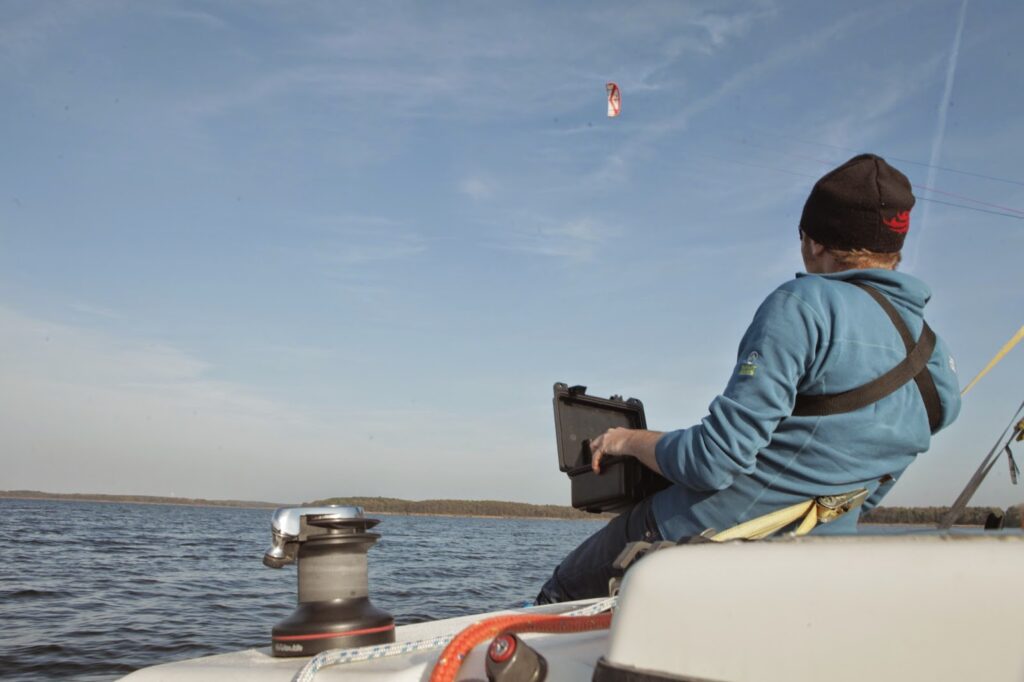 Windenstand auf dem sich ca. 150m Dyneema Seil befindet. Daran wird ein Kiteschirm befestigt, ähnlich wie ihn die meisten von den Kite-Surfern kennen, welche bei Winden jenseits der 4 Beaufort über das Wasser jagen. Gelenkt wird das ganze per Fernbedienung mit einem Joystick. Nachdem der Drachen erst einmal vom Wasser aus gestartet ist kann man die Fernbedienung zur Seite legen, denn von nun an übernimmt die Steuerung des Schirmes eine Autopilot. Man muss sich nur noch um das Lenken des Bootes kümmern. Gesegelt oder gekitet können alle Kurse werden welche auch mit der klassischen Besegelung möglich waren. Wenn man ordentlich Schub haben möchte lässt man den Drachen achten fliegen, das erhöht den Schub um ein vielfaches – man spürt es an Bord an der starken Beschleunigung. Dies zum Prinzip. Nun zu den für uns wichtigen Vorteilen: